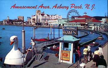 Image 5.12.1. Wesley Lake and a few of its attractions. In my opinion, this is the quintessential Asbury Park postcard from the '50s. All the colors are correct. In the foreground is the famous Swan Boat all loaded and ready to go. We see the ticket booth for the Swan and for the other water-borne attractions - the Motorboats (see them at right on their little course), and the U-Peddle Boats (see them dallying freely out on the lake). There's the chalky-green Palace Amusements (our eventual destination) across the street. As you can see, the Palace Amusements is made up of two sections, the corner, with its red roof looking like a beveled, flattened pyramid; and the more box-shaped Annex further down the block. The Ferris wheel divides the two parts. Do you see that great Spanish-Moorish palace across the street from the Annex? That is the magnificent Mayfair Theater, which we will go into later on. It plays an important role in what the Wesley Lake area was all about. Practically attached to the north side of the Mayfair Theater is another movie palace, called the Saint James (right under the "Asbu" in the word "Asbury" on the postcard). You can't see it very well, but the low building just above the Swan's head is a wonderful old bus station. It was appealingly antique, of old white stucco, with a gilt ticket window and worn white tiles. The tower at the left of the scene, in the distance, was the Renaissance clock tower of our department store, Steinbachs. It is on Cookman Avenue, our main shopping district. Steinbachs looks distant in this photo but it's really only a few blocks from here, a really easy walk. By the way, if you'd like to see the nighttime version of the above postcard, click HERE. Now I'd like to drag you to one other spot before we head for the Palace Amusements. I will show you what was my favorite section of the Boardwalk. Come on! Let's go through the corridor of the Heating Plant and back onto the boards, on the other side of the Casino. You can use the wooden stairs if you like.