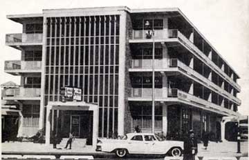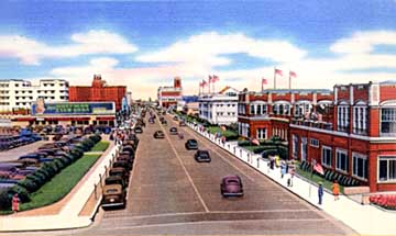 Image 2.12.1. Ocean Avenue, looking north. (Photo by Chuck Agreen.) Click HERE to see a very similar photograph taken about 1910! On our right is the First Avenue Pavilion. The white building next to it is the Natatorium (the indoor Boardwalk pool). In the farther distance we see our old friends the Paramount Theater and the Berkley Carteret Hotel. The white building to the far left of the scene is the Albion Hotel. Popular establishments such as Mrs. Jays (a bustling eatery), and the Wonder Bar (so-called World's Longest Bar) were found on the west side of Ocean Avenue. Some gaming spots, featuring skee-ball and other amusements, also resided on the this side of the street. The present photo does not allow us to turn our heads much; but the parking lot on our left belongs to a magnificent hotel, the COLEMAN HOUSE. The Coleman was torn down in the '50s and replaced by a modern motel, the Empress. Here is a photo of the Empress: