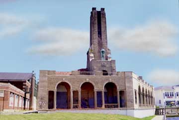 Image 4.12.1. The Heating Plant today (a bit computer-cleaned). Above is a head-on shot of the Heating Plant (computer-cleaned but still decayed). Were it not for the arty deco exterior it would have been an ugly sight. The style is that interesting combination of Moorish, Venetian and Egyptian that we have seen (and will continue to see). Now let's go up to the passage behind the row of lakeside arches at right and turn around. Wow! Nice angle!