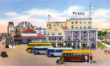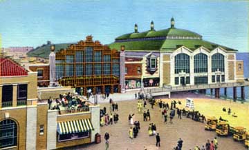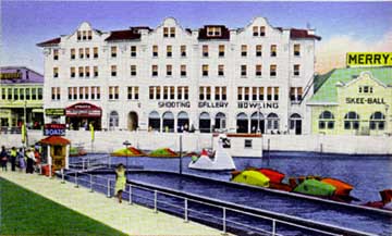 Image 3.13.1. Our view from the front of the Casino Crown. Notice the Plaza Hotel just in front and to the right of the Palace Amusements. I don't remember the Plaza (except in a kind of unconscious way). It was torn down I the early 1950s. For years an empty "island" of pavement has marked its location. The hotel had a restaurant and open-air bar. It was one of the "hot spots" in the '40s (though it is much older than that, dating at least to 1905, when its appearance was more Victorian). As I write these words, you can still see the red and white floor tiles of the hotel in the pavement. (The name "Plaza" is spelled out on one of the slabs.) On a "dig," I swiped a few of the tiles.