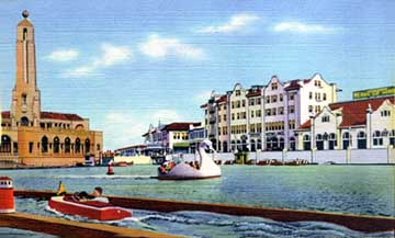 Image 5.13.1. Wesley Lake and the North End Hotel. The above is one of my favorite postcards. It has a clean, crisp sparkle to it that recalls the Asbury of my childhood. Note that there was a movie theater, the Strand, in the North End Hotel. I remember being in it once, in later years. It was at that time a smallish homespun place. While the village of Ocean Grove was - and is - a Methodist town, founded on religion, its Wesley Lake border offered some "secular" entertainment. You can see Ocean Grove's Merry-Go-Round pavilion to the right of the photo. Just outside the picture is the North End Hotel POOL. (That makes four pools so far!) I've always called it the Ocean Grove Pool. Another little amusement pavilion was a few steps west of the pool. I think an impressionistic artist like George Seurat would have liked to paint a Wesley Lake scene. Click HERE to see my attempt to mimic this idea, using the above postcard. Let's walk a little further and turn around again.