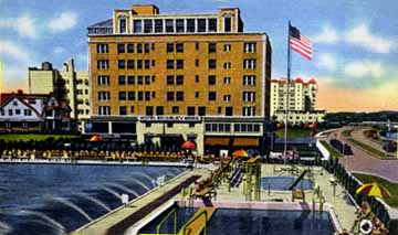 Image 8.23.1. The Kingsley Arms Hotel with the Monte Carlo Pool in the foreground. Deal Lake Drive, and Deal Lake, is to the right. The Santanter Hotel is in the distance, behind the flag. The list of once-exciting places could easily continue. Suffice it to say that the Asbury Park beachfront, in the eight-or-so blocks from Deal Lake to Wesley Lake, was filled with the kind of sights that typified a classic seaside resort (but rarely with the gaudiness that some places had). While exposure to the Asbury of old has left a glowing impression in the minds of visitors, the effect is probably greater for those of us who lived there year round. In the final chapter, I will tell in a lyrical-analytical way the "structure" of Asbury Park as it survives inside me. So pour a glass of wine, relax and get into the"far-off" mood.