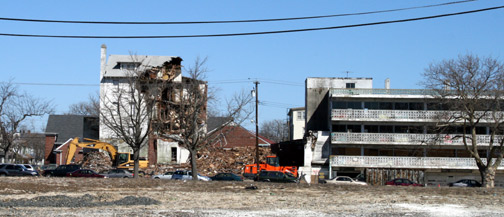 Image 1.23.1. Ocean Avenue at Night. This photo was taken by local photographer Chuck Agreen from the top of the Casino. I cannot count for you the number of hotels and other hostelries that little Asbury Park once boasted. "Over 200" was one estimate made in the years gone by. Among the most notable surviving large hotels is the Metropolitan, on Asbury Avenue and Heck Street, off library Square, and a block or so northwest of the Saint James Theater. The name "Metropolitan Hotel" appears, in the same place, on a 1889 map I have of Asbury Park. Originally a wooden frame structure, it was redone in concrete around 1915, perhaps the first use of the material for building in Asbury Park. The establishment was noted for keeping a Kosher kitchen and therefore catered to many Jewish clients. In appearance, the Metropolitan was a classic seaside grand hotel. Even a simple photo of it can conjure up a sense of time, place and adventure.