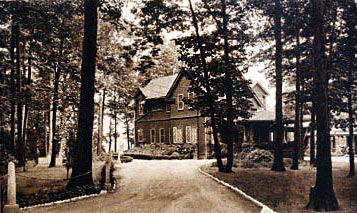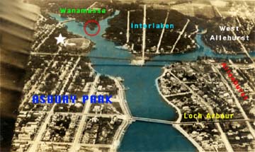 I remember, one autumn morning, as I sat in Nick Merli's Italian class, I looked out the window across the athletic field to Deal Lake and Interlaken beyond. The view was A soothingly beautiful expression of the season. Image 1.37.3. Deal Lake from Asbury, showing Wanamassa Point and Interlaken. Actually, I took the above photo just outside the school, a couple of hundred yards west of where I was sitting. The spot with the house on it is the peninsular tip of Wanamassa, where the south branch of Deal Lake divides. The peninsular town of Interlaken is at right (where my family lives). Again I must show you one of my favorite postcards: Image 2.37.3. Deal Lake again and the towns. The white star shows the location of Asbury Park High School.The red circle indicates the penninsular tip of Wanamassa. Those of us locals who like old postcards will know that on the tip of Wanamassa there once stood an establishment called Ross Fenton Farm. Few under the age of 60 remember it. It was owned by the husband-and-wife vaudeville team Charlie Ross and Mable Fenton (known as Ross and Fenton). The opening, in 1899, of their rustic roadhouse-restaurant-nightclub (call it what you please) attracted many of the Weber and Fields vaudeville personalities with whom Ross and Fenton had worked. In 1902, the comedy team sold the establishment and returned to vaudeville. When Charlie died, in 1918, Mable came back to Wanamassa to run the business, which she did until her death, in 1931. Much exciting activity took place there, but I will save an account of it for the Chapter on Wanamassa in the section titled Towns Around Asbury. Image 3.37.3. Ross Fenton Farm Well, now ... this is about it for the central westside. We have one more section to cover, the southwest side. This is one of the most interesting areas of Asbury Park, though it often seems a world away... Click on, traveler, to find out what I mean!
